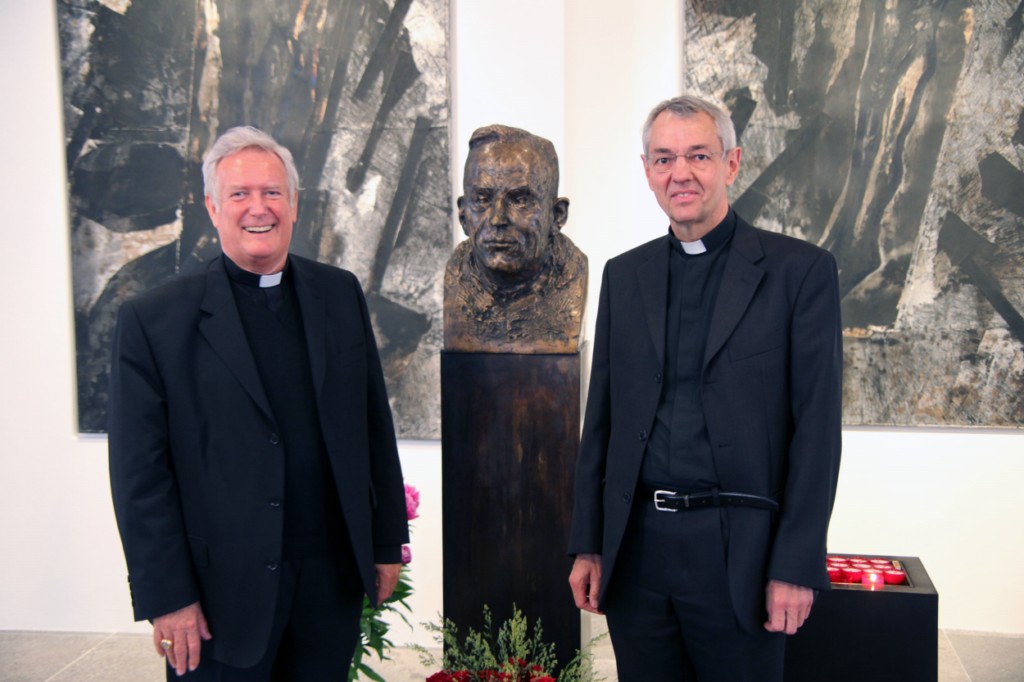Zu Beginn der Vesper hieß Oberschwarzachs Pfarrer Stefan Mai die Bischöfe, Domkapitulare und Domvikare willkommen und zeigte auf, was ihm persönlich geholfen habe, einen ehrlichen und unverkrampften Zugang zu Georg Häfner zu finden. Zum einen zeige der neue Selige, dass das, was einen spirituell präge, auch im Leiden Kraft gebe. Zum anderen habe Häfner das Sperrige an ihm, das was bei den Leuten nicht gut angekommen ist, das Rückgrat gestärkt und im Konzentrationslager die Widerstandskraft bis zum Märtyrertod gegeben. Mit Blick auf die Häfner-Büste von Rainer Stoltz an der Gedächtnisstätte im hinteren Teil des Gotteshauses von Oberschwarzach sagte Mai: „Wir haben einen Mann im Rücken, der Rückgrat zeigte, auch wenn man ihn zerbrach, der standhielt, auch wenn man ihn zermürbte.“