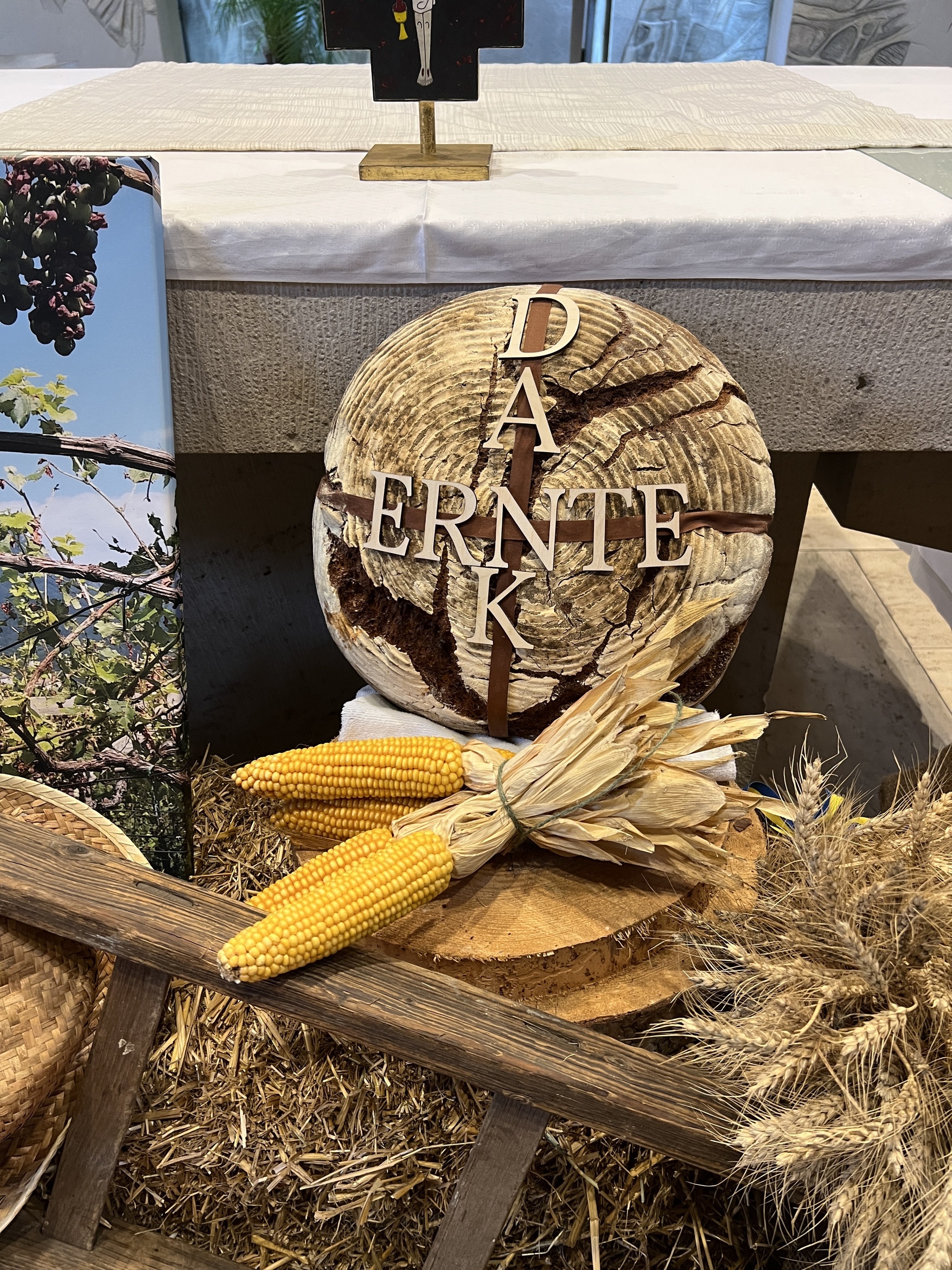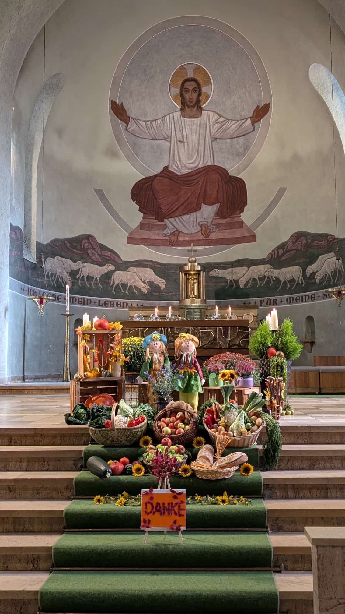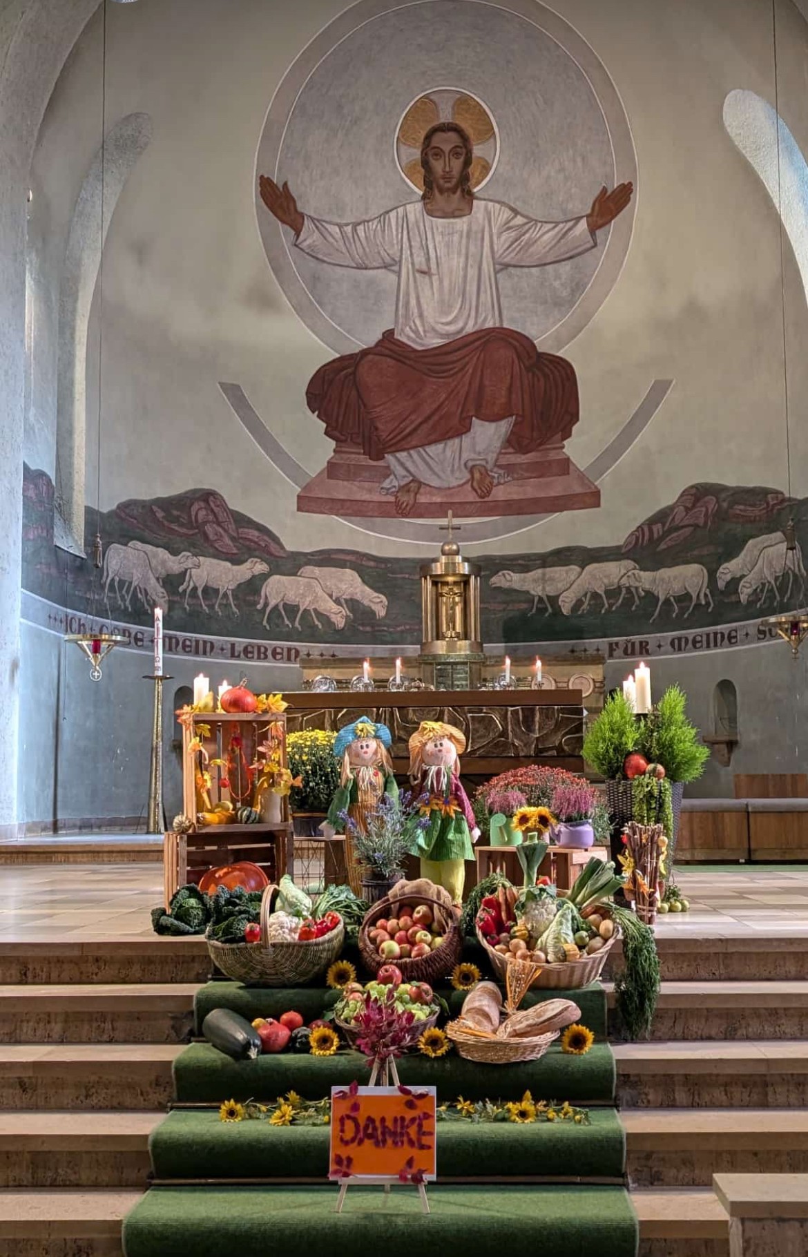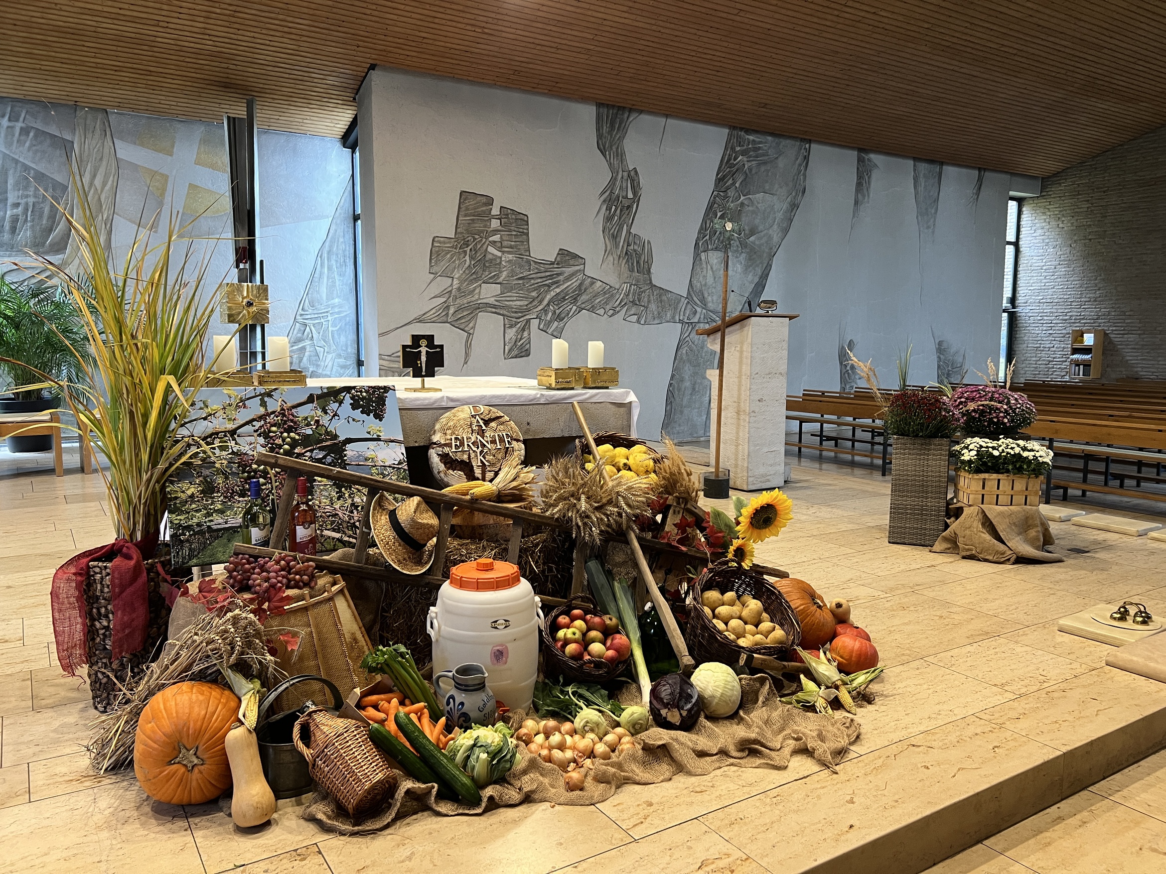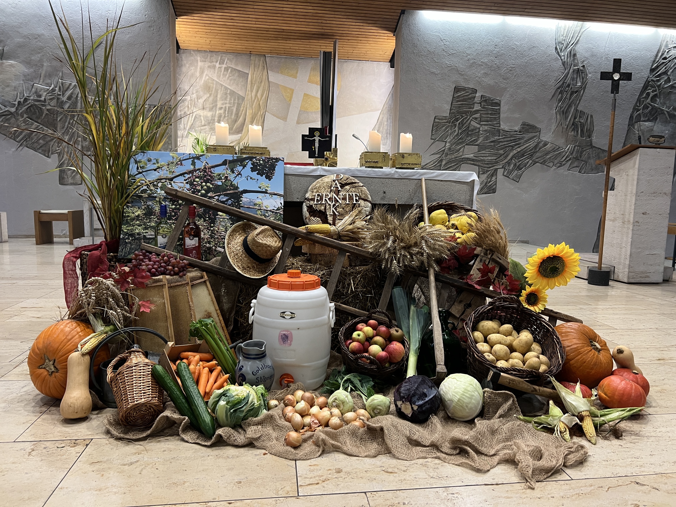 Vor kurzem haben wir das Erntedank-Fest mit liebevoll geschmückten Altären in unserer PG gefeiert. In Herz Jesu haben am ersten Oktoberwochenende wieder die Kleingärtner der Fasanerie/Radieschenheim unseren Altar wunderbar und fantasievoll gestaltet. In St. Pius hat Familie Müller eine Woche später und passend zum Weinfest für den Erntedank-Schmuck gesorgt, Organist Robert Eidenschink hat das Brot dazu gebacken. Herzlichen Dank allen, die uns diese schön geschmückten Altäre geschenkt haben.
