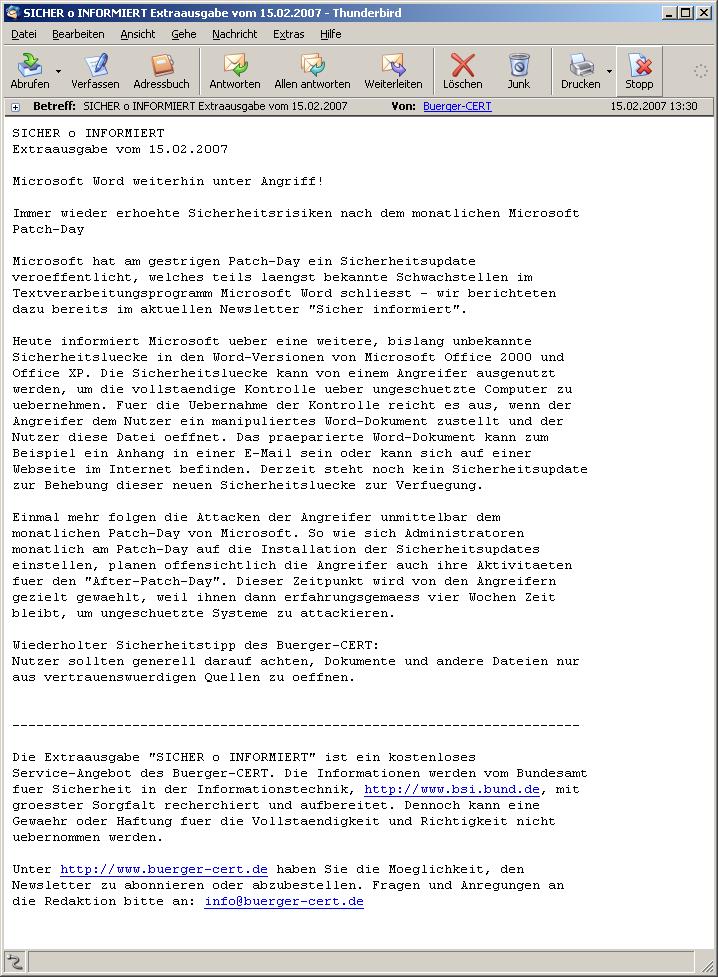 Betroffen sind die Microsoft Word-Versionen 2000 und XP. Nach Angaben des BSI kann die Sicherheitslücke von einem Angreifer ausgenutzt werden, um die vollständige Kontrolle über ungeschützte Computer zu übernehmen. Gemeinsamer Ratschlag aller Experten: Nutzer sollten darauf achten, Dokumente und andere Dateien nur aus vertrauenswürdigen Quellen zu öffnen.