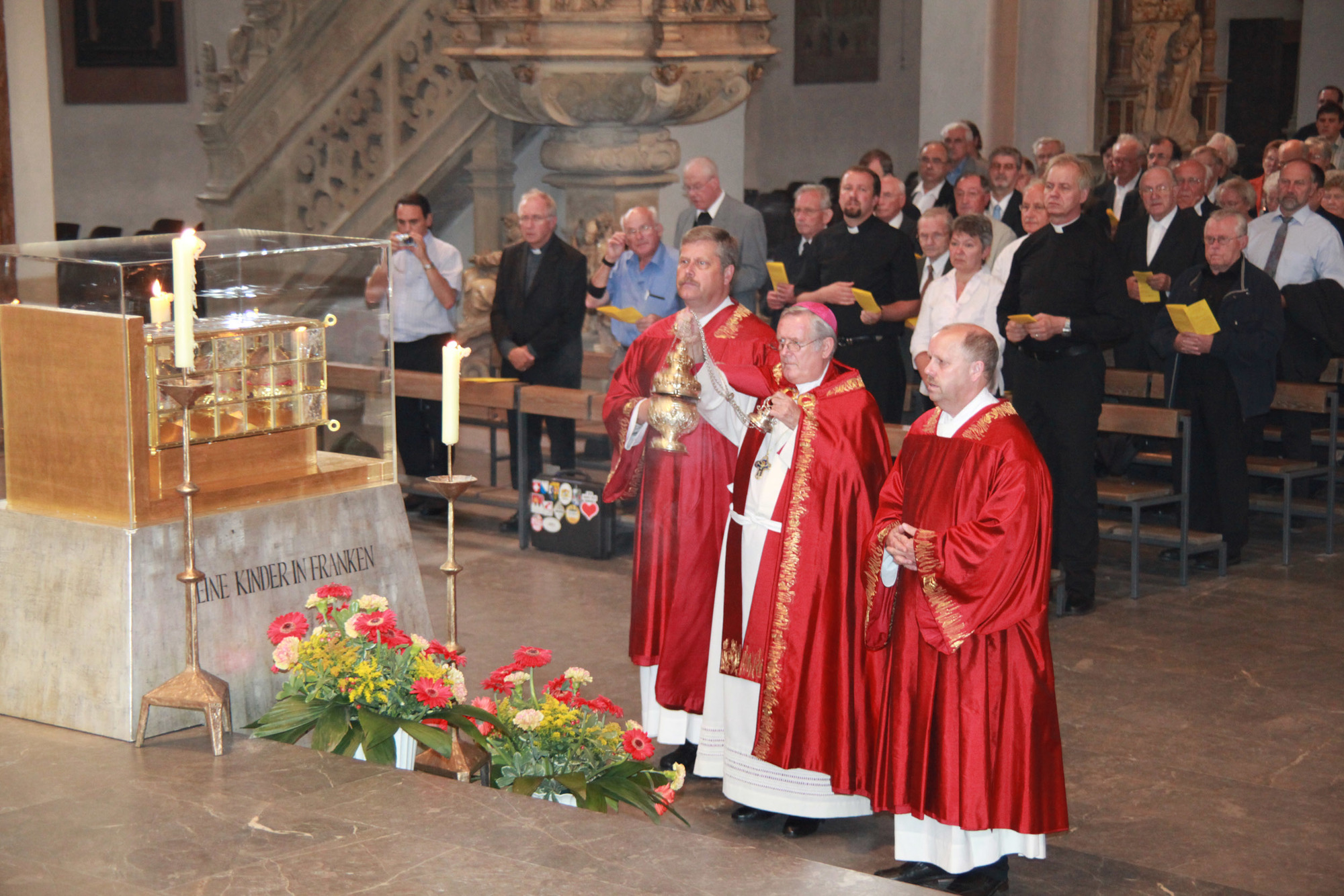 Würzburg/Rom (POW) Papst Benedikt XVI. hat den im Konzentrationslager Dachau gestorbenen Würzburger Diözesanpriester Georg Häfner (1900-1942) offiziell als Märtyrer anerkannt. Das gab Bischof Dr. Friedhelm Hofmann bei der Vesper für Priester, Diakone und pastorale Berufe am Dienstag, 7. Juli, in der Kilianiwoche im Dom bekannt. Gleichzeitig sprach der Papst dem ebenfalls in Dachau gestorbenen Mariannhiller Missionar Engelmar Unzeitig (1911-1945) den heroischen Tugendgrad zu. Die entsprechenden Dekrete der Heiligsprechungskongregation hatte Benedikt XVI. am Freitag, 3. Juli, genehmigt. „So dürfen wir voller Dankbarkeit einer Seligsprechungsfeier entgegengehen, denn beide haben auf ihre je eigene Weise ein Glaubenszeugnis hinterlassen, das uns die Augen für das Wichtige und Entscheidende in unseren Tagen öffnen kann“, sagte der Bischof vor rund 600 Seelsorgerinnen und Seelsorgern im Kiliansdom.