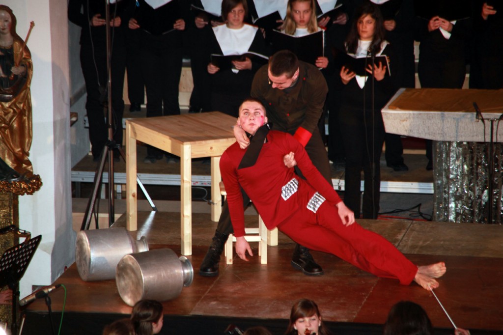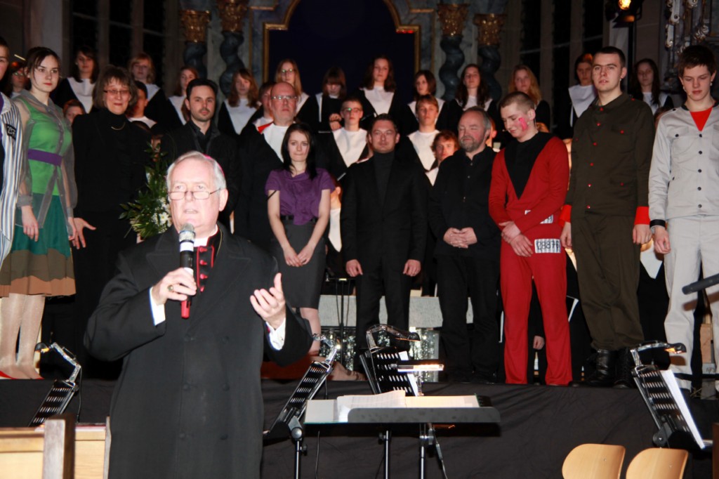 Münsterschwarzach (POW) Am Donnerstag, 14. April, wird um 19.30 Uhr in der Abteikirche Münsterschwarzach das Oratorium „Häfner – eine Entscheidung“ gezeigt. Rund 130 Schülerinnen und Schüler des Münsterschwarzacher Egbert-Gymnasiums sind an der Aufführung beteiligt. Über 1500 Besucher kamen an zwei Wochenenden im März in die Kirche nach Oberschwarzach und in die Würzburger Seminarkirche Sankt Michael, um das Oratorium anzusehen. Wegen der großen Resonanz gibt es den Zusatztermin in Münsterschwarzach. Zahlreiche, zum großen Teil überschwängliche Kritiken von Bischof Dr. Friedhelm Hofmann, Weihbischof Ulrich Boom, Domdekan Monsignore Günter Putz, Abt Michael Reepen und vielen anderen begeisterten Zuschauern stellten das Oratorium als „Meilenstein“ auf dem Weg zur Seligsprechung von Pfarrer Georg Häfner dar. Viele Besucher zeigten sich tief beeindruckt. Neben der Begeisterung über die ansprechende Leistung der Sänger und Musiker war auch eine große Nachdenklichkeit am Ende der Aufführungen in den Gesichtern der Zuschauer zu sehen. Der Eintritt ist frei.